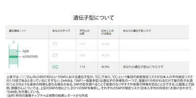 問題なのは、この数値が一見、「利用者が疾患を発症するリスク」のように見えることだ。しかし、実際に出しているのは日本人の平均発症リスクを1とした場合における、その人が属するSNP型集団の発症リスク比。平均点60点のクラスには20点の人もいれば90点の人もいるように、リスク0.84の集団にもリスクが0.55や1.75の人がいる。図に挙げた肺がん(肺腺がん)0.84倍という数値もクラスの平均点であり、そこに属する個人にとってはあくまでも目安でしかない。