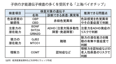上海バイオチップは、01年、中国政府の9割出資によって設立された遺伝子研究・開発の拠点。日本にも20社以上の代理店があり、58000円の料金で、記憶力、注意力、理解力、想像力などの「学習能力(IQ)」、勇気、羞恥心、楽観、探究心、同情心、社交性などの「感情(EQ)」、聴覚、音感などの「音楽能力」、色覚、美的感覚などの「絵画デザイン能力」、音感、耐久力などの「ダンス・リズム感」、筋力、速度、瞬発力などの「運動能力」の6分野41項目を検査できる。