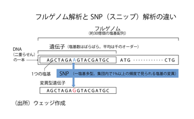 しかし、ひとつが他の塩基に入れ替わっているだけであれば、ほとんどの場合、髪の色や目の大きさといった「個性」として現れるに過ぎない。これが個人向け遺伝子検査で見ている「SNP(スニップ・一塩基多型)」と呼ばれる遺伝子型だ。
