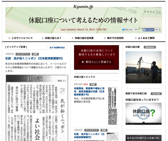 事例としては、駒崎弘樹さんが旗を振った「休眠口座」は鮮やかだと思います。わかりやすいウェブサイトを作り、各国の事例を研究した「白書」をリリースし、議員を集めてシンポジウムを開催し、要望書を提出し…テーマ自体が「現場支援」ではないとはいえ、すばらしい手際で感動しました。法制度化まであと一息といったところでしょうか。