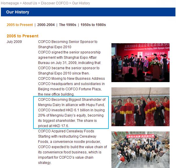 蒙牛の企業形態も変えた。さすがに食の安全性を問題視した中国政府の意向もあったのだと思うが、事件の最終段階(2009年7月)で、国営企業のCOFCO(中糧)が蒙牛へ資本参加した。その詳細はここにあるので、お読みください。(下記事はCOFCOのHPから)