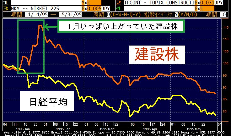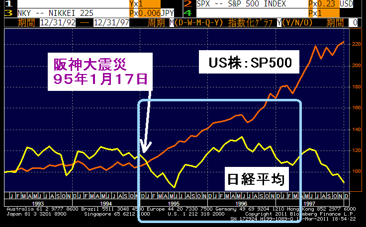 日本株の下落は阪神大震災が原因である部分は当初数日間に限定され、その後は円高加速による部分が多かったと記憶している。