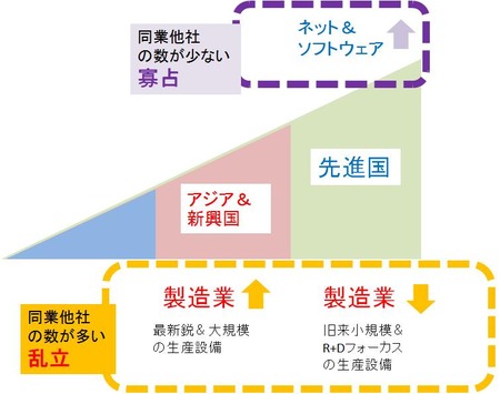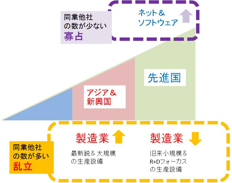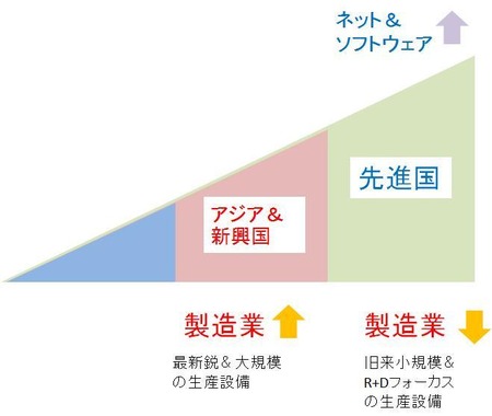 前回、新興国における重厚長大産業のTake Offと、先進国の高度に発展したIT、サービス、軽薄短小のビジネスの深化を書いたが、その図が下の最初の図だ
