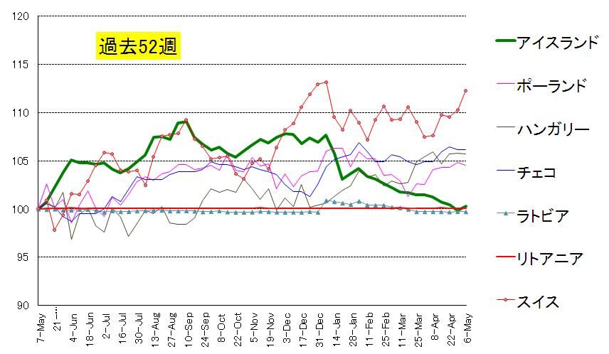 こういうガタガタした状況ですから、安全通貨スイス・フラン(赤線)は上昇しました