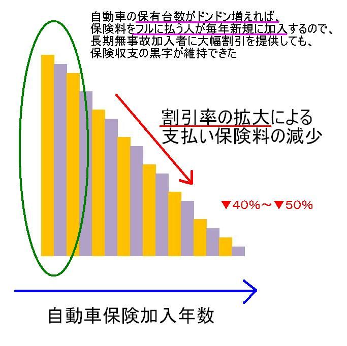 無事故割引制度は、新規に自動車を購入して100%の保険料を払う契約者が毎年増加する事を前提に、大幅な値引き率が設定された。