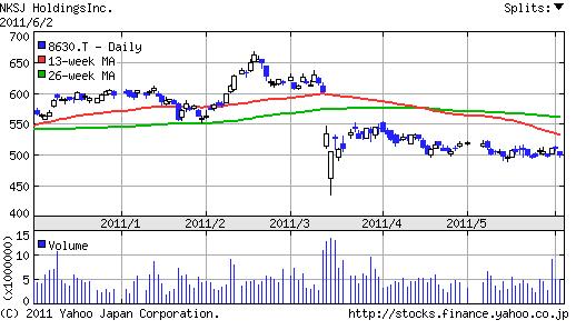 下は自動車保険が多い、NKSJホーレディングスの株価推移