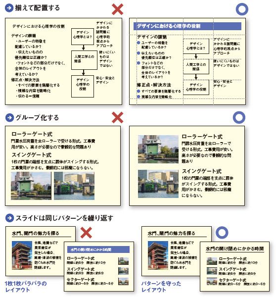 揃えて配置する/グループ化する/スライドは同じパターンを繰り返す