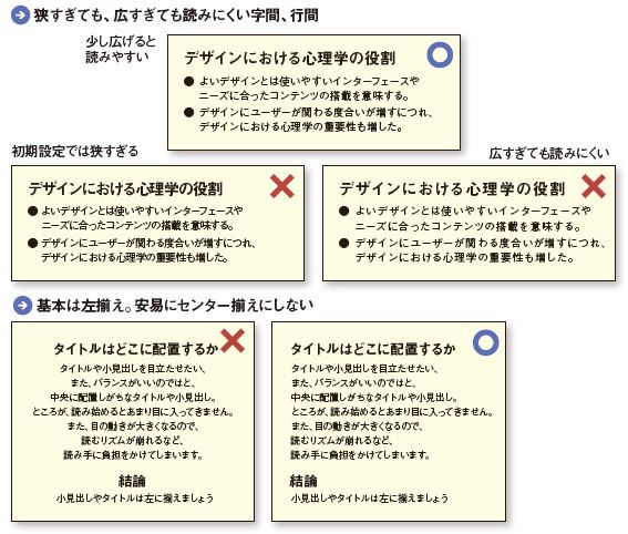 狭すぎても、広すぎても読みにくい字間、行間/基本は左揃え。安易にセンター揃えにしない