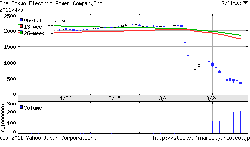 なお、東京電力の株価は、5日、ストップ安となる362円で取引を終え、上場後の最安値を約59年半ぶりに更新したようです。時価総額は震災前3月10日に比べ3兆円近く減少したことになります。