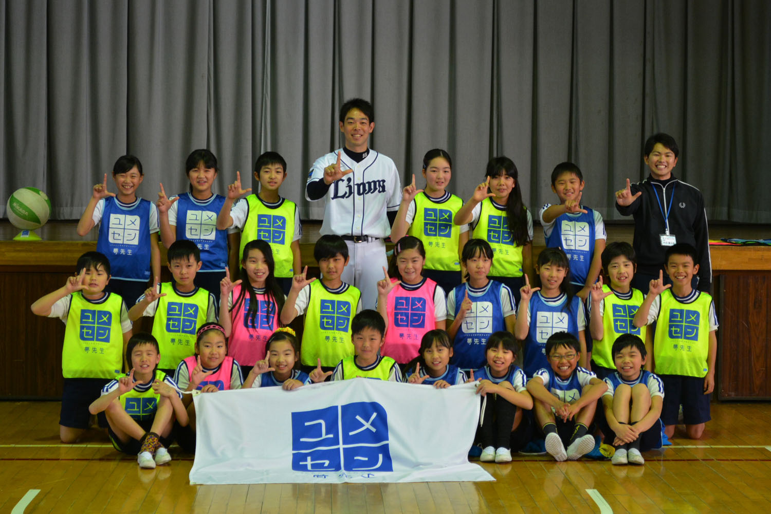 5時間目終了後に、ライオンズを現すL字を作って、全員で記念撮影。一緒に体を動かし、気持ちが伝わる授業だった