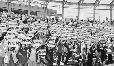 (写真)「NON」の紙を掲げ、上関原発ノーの思いをアピールする参加者=26日、山口市