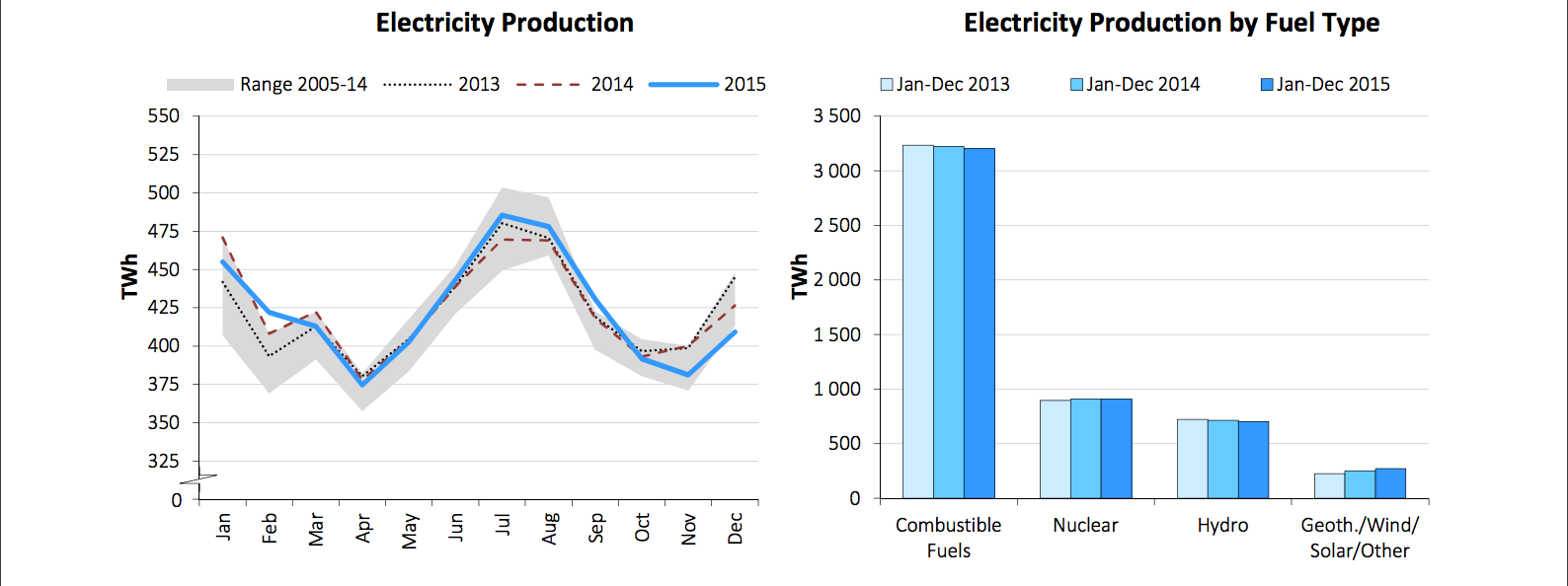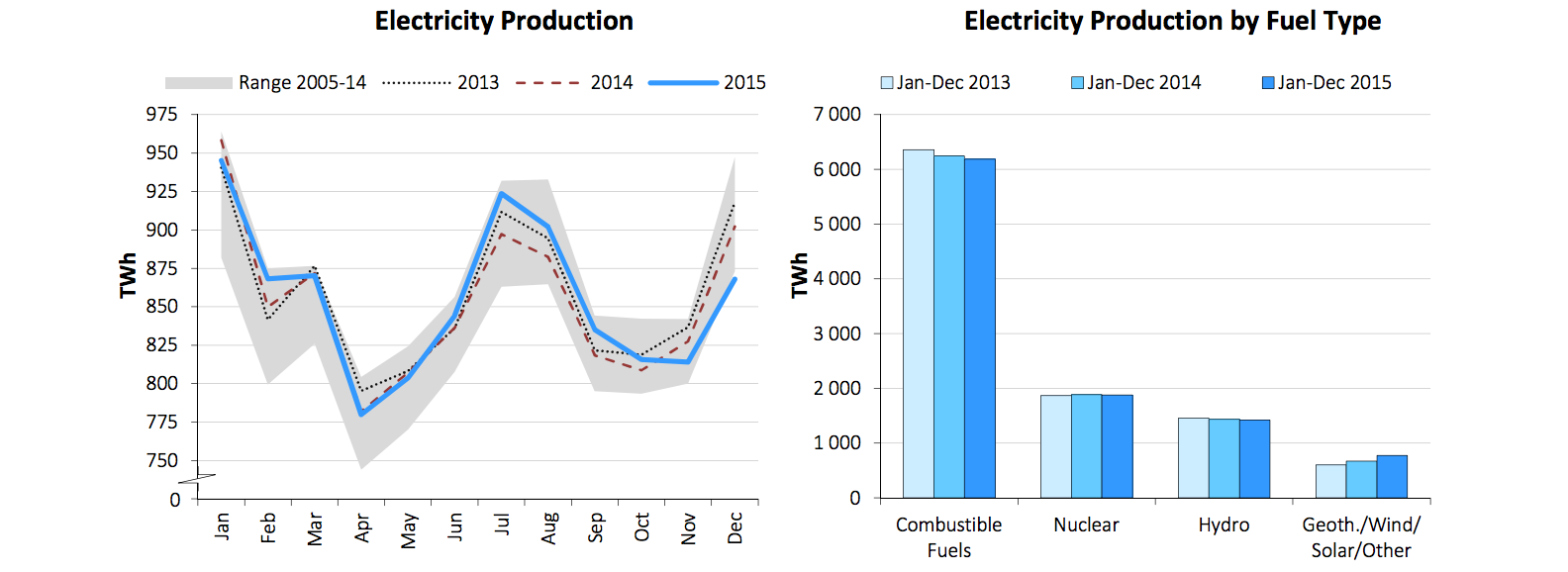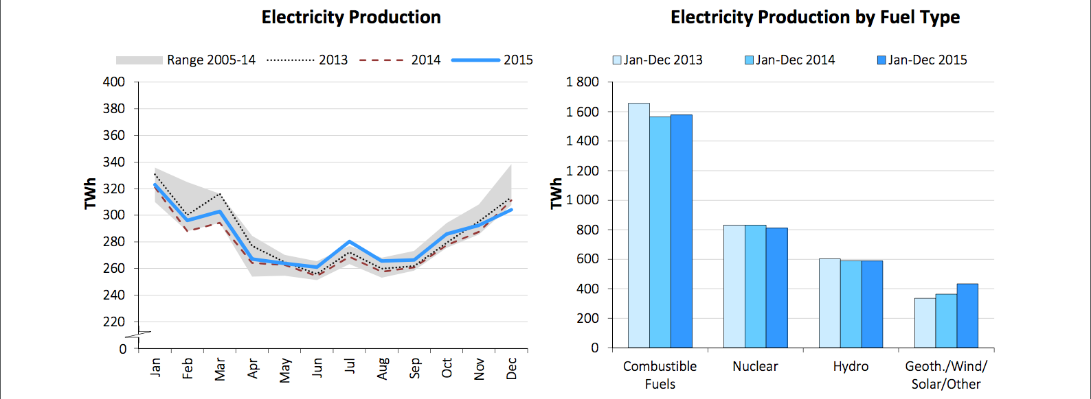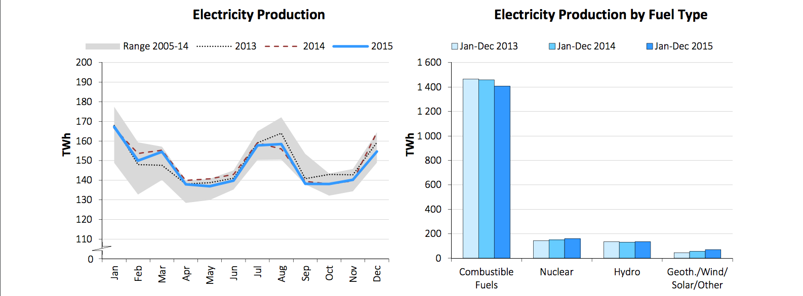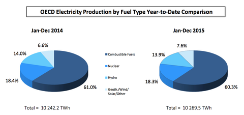 これに関しては、先月15日に国際エネルギー機関(IEA : International Energy Agency)が公表した “Monthly Electricity Statistics December 2015” に、OECD諸国ベースの各電源に係る発電電力量のデータが掲載されている。