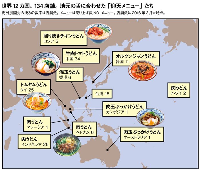 丸亀製麺は現在、中国とタイでは合弁会社をつくり、ほかに米国、ロシア、韓国、台湾、オーストラリアなどにも出店しており、海外の店舗数は100を超える。海外進出においても、製麺所方式は有利に働く。工場建設や流通整備が必要だと、絶対に失敗できないので、入念なマーケティングが必要になるし、複数軒同じタイミングで出店しなければ採算が合わない。丸亀製麺の場合、設備投資は店舗一軒分で済む。