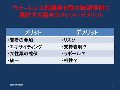 クリントン陣営における若者の不足は、6月7日のカリフォルニア州等で行われる予備選挙まで続くと筆者はみています。この問題を解決できる唯一の方法は、「副大統領候補のカード」を切ることです。若者と未婚の女性を引きつけ、エキサイティングと情熱をクリントン陣営にもたらし、しかも「非常にリベラル」な有権者と統一が図れる副大統領候補が、同陣営には不可欠なのです。以上の条件を満たす副大統領候補は、エルザべス・ウォーレン上院議員(民主党・マサチューセッツ州)でしょう。