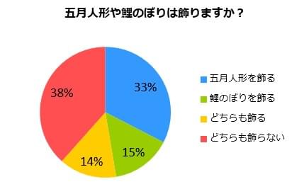 3月の桃の節句が女の子の日であるのに対して、5月のこどもの日は、男の子の日でもあります。鯉のぼりや五月人形を飾る慣わしもありますが、みなさまのご家庭でも飾られるのでしょうか。アンケートで聞いてみたところ、38%のかたが鯉のぼりも五月人形も飾らないと回答。