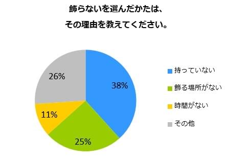 飾らない理由についてもうかがってみました。「持っていない」がもっとも多く38%、「飾る場所がない」が25%でした。
