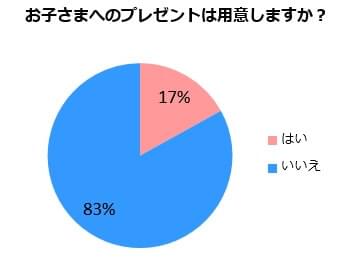 お祝いといえば、プレゼント。こどもの日のお祝いとして「プレゼントを用意しますか?」についても聞いてみたところ、「はい」と答えた人は、17%でした。