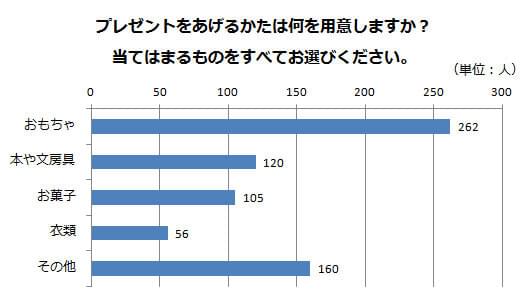 用意しているものとしては、「おもちゃ」が最も多い結果に。その他の回答としては「お小遣い」「靴」「野球のチケット」というのもありました。