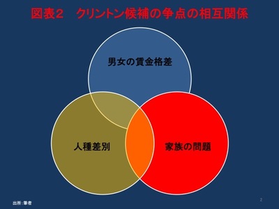 クリントン候補は、男女の賃金格差是正や育児世帯における有給の病気休暇制度など有権者のために戦っているというメッセージを発信しています。クリントン候補はニューヨーク市で行った演説で、男女の賃金格差について他の争点と結びつけて述べました。米国社会は、女性が約50%の労働力を占め、一家の稼ぎ手となっています。同候補は、1つの争点は他の争点と相互関係にあると指摘し、男女の賃金格差は家族の争点であり、人種差別でもあると示唆しています(図表2)。その狙いは、個別に争点について議論をするサンダース上院議員との相違を明確に有権者に示すことにあるのです。