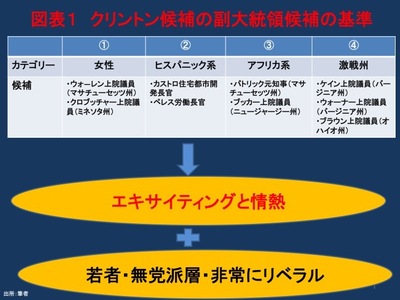地上戦重視のクリントン陣営は、本選で豊富な資金力を活用して戸別訪問のプロを採用することは可能ですが、やはりサンダース陣営に情熱を燃やしているボランティアの若者が必要です。副大統領候補のカテゴリーには女性、ヒスパニック系、アフリカ系並びに激戦州がありますが、どの候補を選択するにせよ、クリントン候補はエキサイティング及び情熱を選対にもたらし、しかも若者、無党派層並びに「非常にリベラル」な有権者の支持を得ることができる候補を選択する必要に迫られています(図表1)。