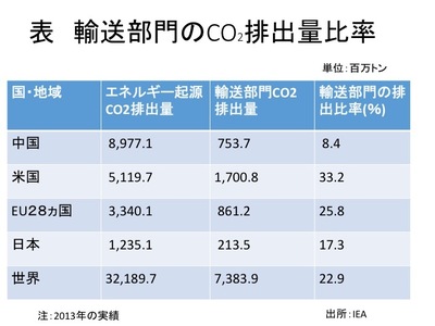 気候変動を引き起こす温室効果ガスの大半を占めるCO2の20%以上は、全地球ベースでは運輸部門から排出されている。国によってその比率は異なり、米国のように車の使用が多い国では高くなり、中国のように国全体では、まだ自動車が普及段階にある場合にはその比率は高くない。表が示す通りだ。