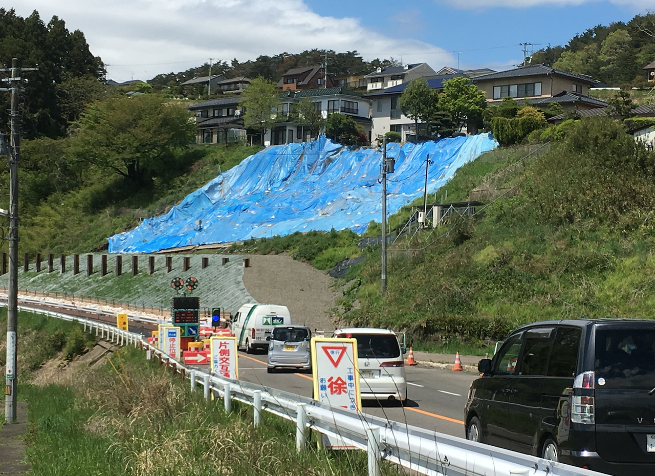 これを見る限り、今もって片側交互通行であり、道路の完全復旧には至っていないようだ。