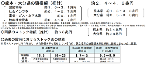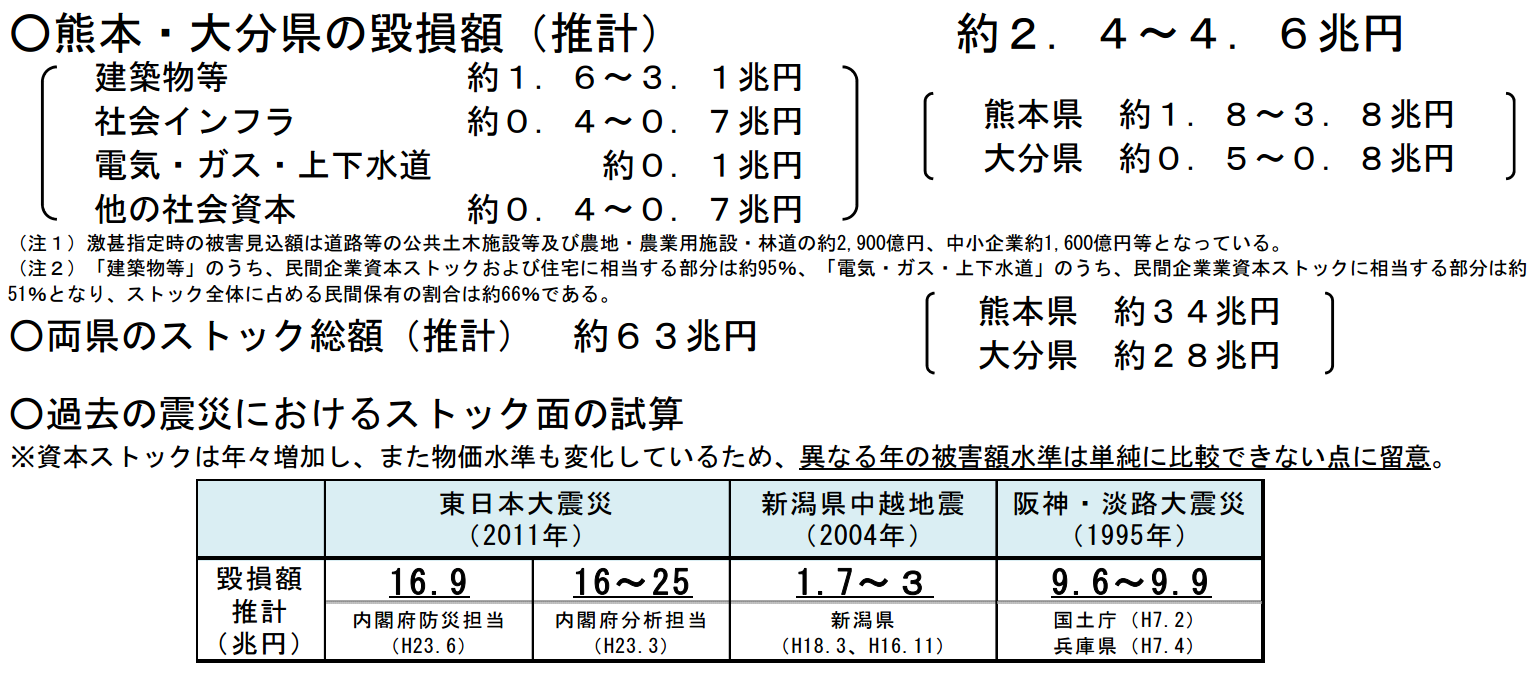 これは、政府が「熊本地震による地域経済や日本経済への影響を分析する一環として、東日本大震災時の推計方法を踏まえ、阪神・淡路大震災や新潟県中越地震の被害状況(損壊率)を参照しつつ、個人住宅や民間企業が保有する機械設備及び建屋等も含めたストック全般の毀損額を暫定的に試算」したもの。