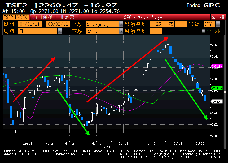 東証2部指数は、7月11日を天井に明確な下落トレンドに入っています。