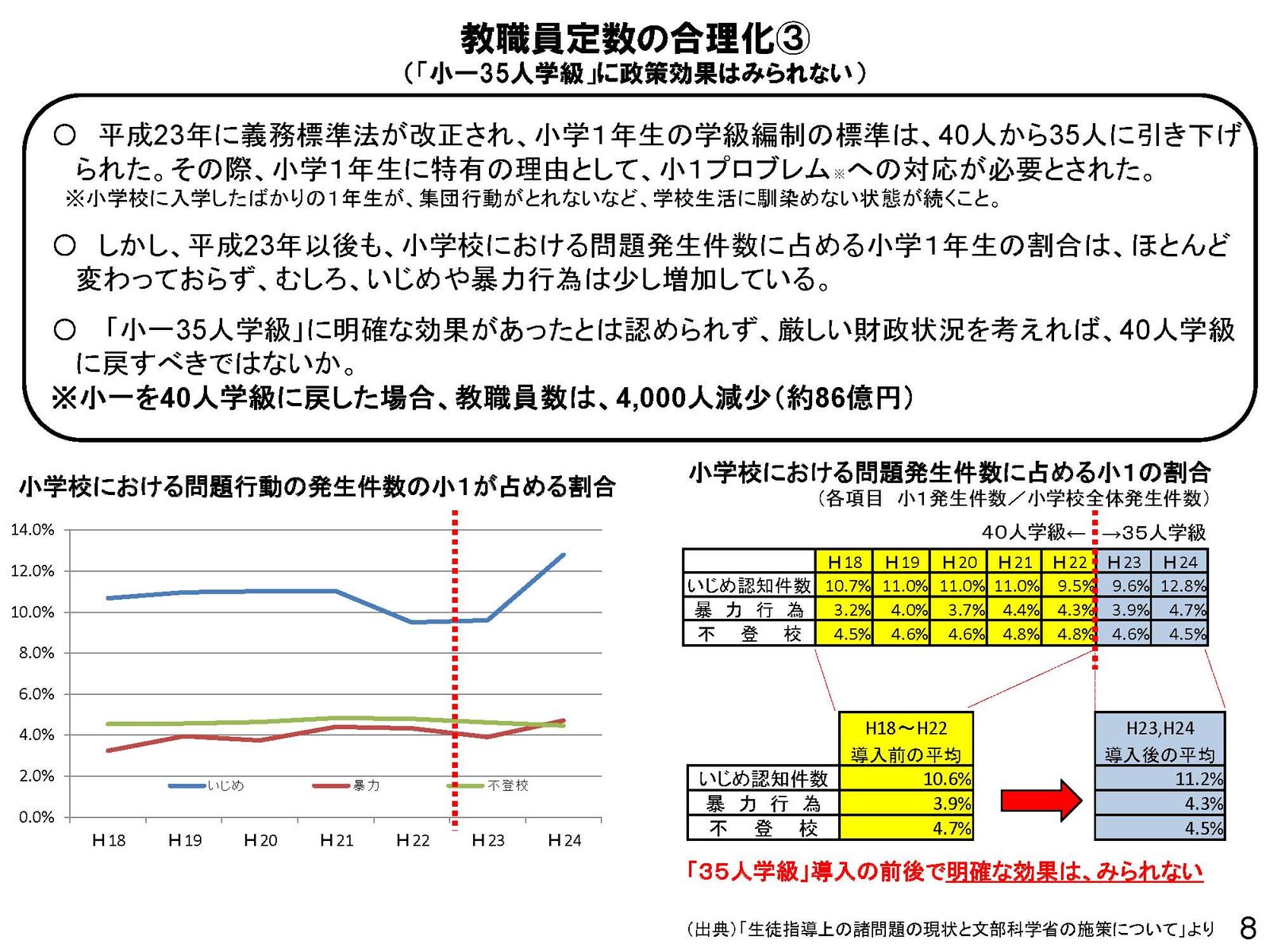 一方で、小一プロブレムの対応が必要とされ平成23年から小学校1年生を40人から35人学級へ引き下げたが、不登校は変わらず、いじめや暴力行為は少し増加している。このことから「小一35人学級」に明確な効果があったとは認められず、厳しい財政状況を考えれば、40人学級に戻すべきではないか。小一を40人学級に戻した場合、教職員数は、4,000人減少し約86億円の財政効果があると示されていた。