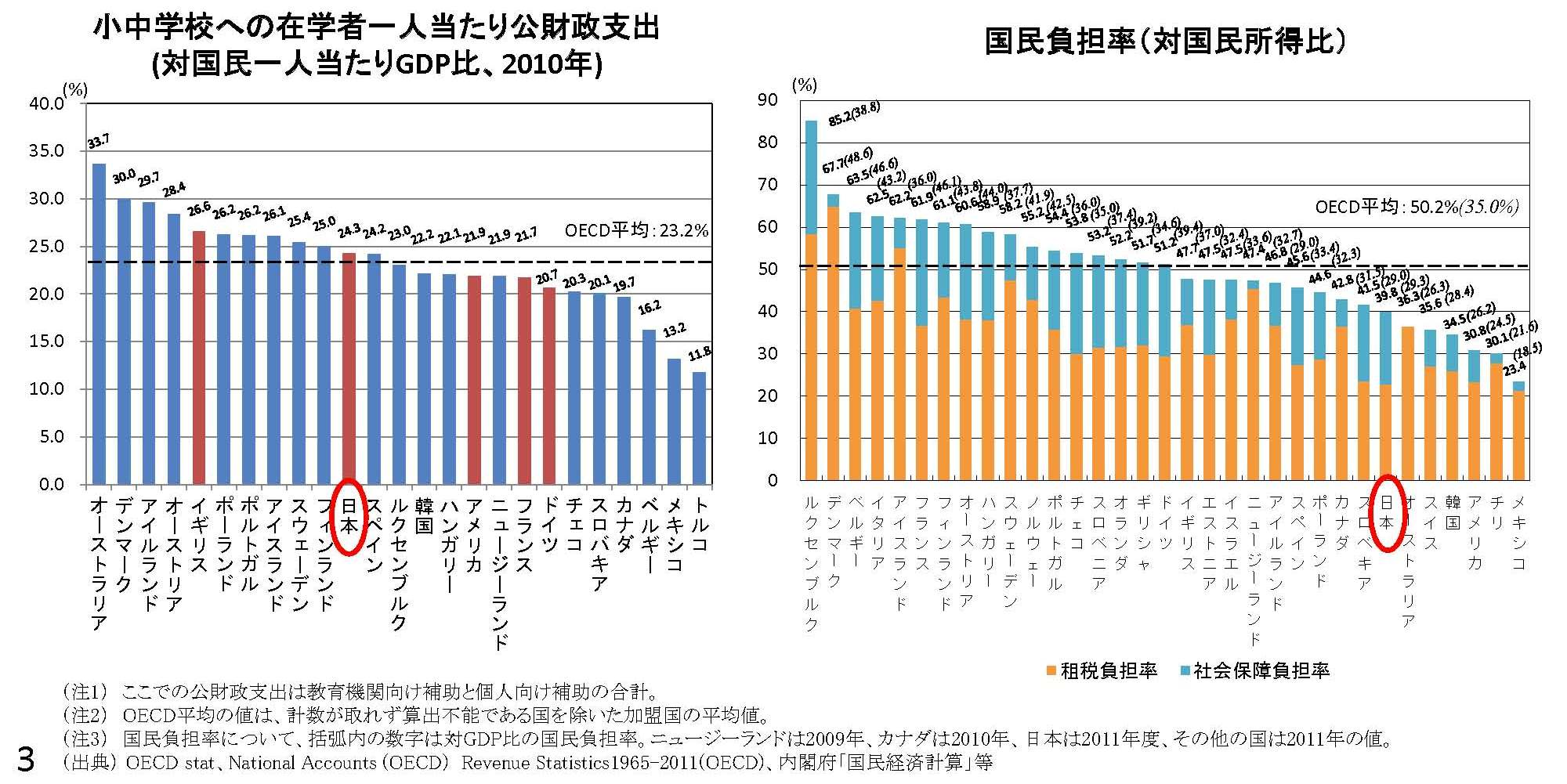 この日の資料を見ると、日本の小中学校向け公財政支出を在学者一人当たりで見るとOECD平均よりも高く、特にG5諸国の中では高水準であり、国民負担率が低水準であることをふまえれば、日本の小中学校には十分に手厚い予算措置が行われている。(画像参照)。