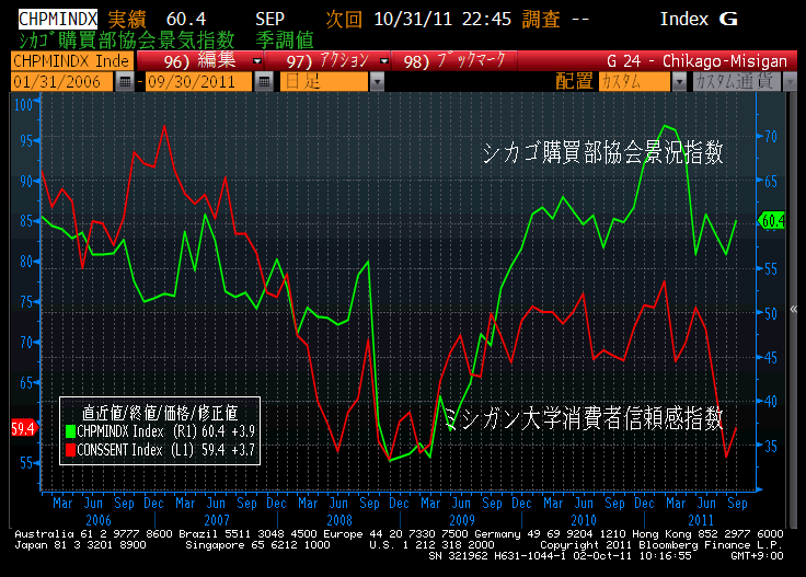 シカゴ地域の数字なので、かなり、地域による特性がでるのですが、それにしても、シカゴ地区で新規受注と雇用が改善しているということは、現時点では、実際の景気は、二番底とかリセッションという状況ではないのだということを表しています。