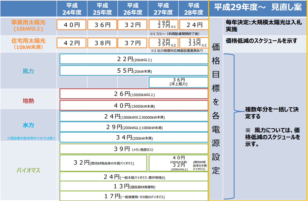 買取価格の推移は、下の資料にある通り。今後とも、メガソーラー(10KW以上の事業用太陽光)は、来年度の入札制度への移行によって一層の買取価格の低減が見込まれている。