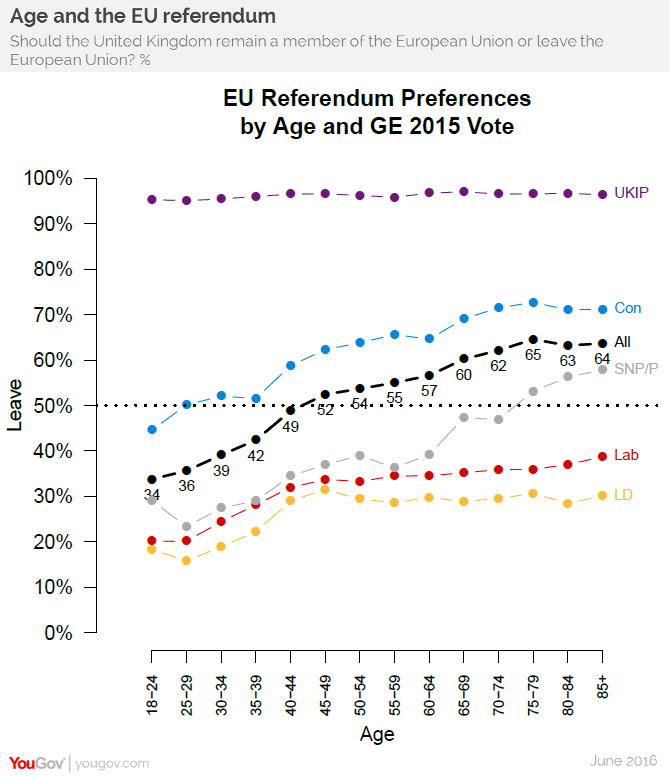 リンク先を見るYouGovは投票前に年齢別/学歴別のEU離脱支持の調査結果を公表している(YouGov | Introducing the YouGov Referendum Model)。ひとつ目は年齢別の傾向だ。常に高い離脱支持を保つイギリス独立党(UKIP)を除いて、保守党(Con)、スコットランド国民党/プライド・カムリ(SNP/PC)、労働党(Lab)、自由民主党(LD)はすべて同じ傾向をもち、高い年齢層ほど離脱に賛成であることが分かる。古き良き時代を覚える高齢者が、EUを離脱して偉大なる大英帝国に戻ることを夢見たのだろうか。