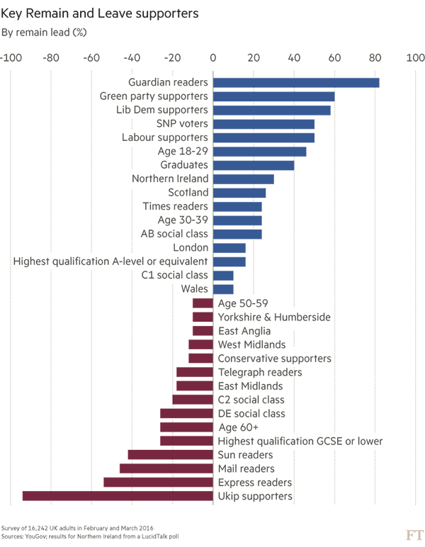 最後はFinancial Timesが調査した各種属性との残留/離脱の支持割合だ(How battle over Brexit crosses traditional party lines — FT.com)。残留を強く支持する人としては、高級紙Guardian読者、緑の党支持者、自由民主党支持者、スコットランド国民党支持者、労働党支持者、18-29歳の若年層だ。一方、離脱を強く支持する人としてはイギリス労働党支持者、タブロイド中級紙のDaily Express読者、Daily Mail読者、大衆紙The Sun読者、高卒、60歳以上などが並ぶ。やはり移民問題の影響を多く受ける層が離脱を支持している事が見て取れる。