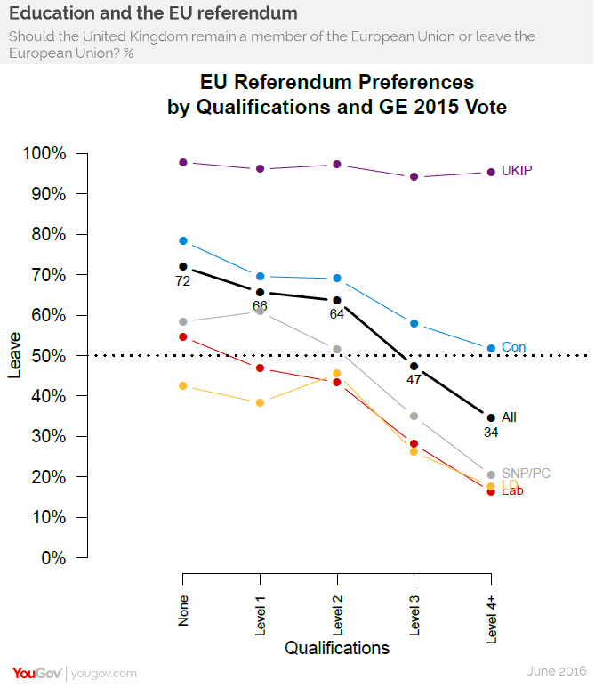 YouGovは投票前に年齢別/学歴別のEU離脱支持の調査結果を公表している(YouGov | Introducing the YouGov Referendum Model)。ひとつ目は年齢別の傾向だ。常に高い離脱支持を保つイギリス独立党(UKIP)を除いて、保守党(Con)、スコットランド国民党/プライド・カムリ(SNP/PC)、労働党(Lab)、自由民主党(LD)はすべて同じ傾向をもち、高い年齢層ほど離脱に賛成であることが分かる。古き良き時代を覚える高齢者が、EUを離脱して偉大なる大英帝国に戻ることを夢見たのだろうか。
