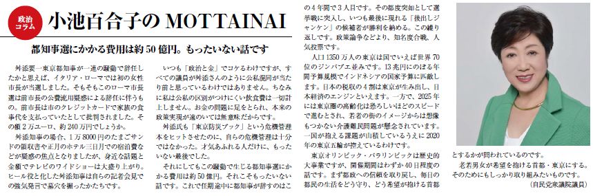 それにしてもこの騒動で生じる都知事選にかかる費用は約50億円。それこそもったいない話です。これで任期途中に都知事が辞すのはこの4年間で3人目です。その都度突如として選挙戦に突入し、いつも最後に現れる「後出しジャンケン」の候補者が勝利を納める。この繰り返しです。政策論争などより、知名度合戦、人気投票です。