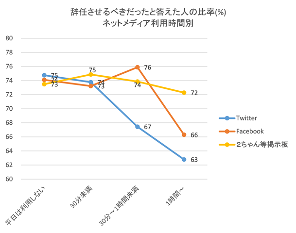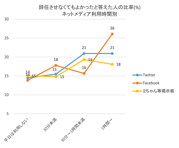 図3は、逆に辞任させるべきだったという人の割合である。上図のネットメディアの場合、すべて右下がりであり、ネットメディアの利用時間が長い人ほど辞めさせるべきだったという人が減っている。特にfacebookとtwitterユーザーでその傾向が強く、利用しない人に比べて10%ポイント近く辞めさせるべきという人が少ない。