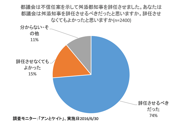 炎上の程度を抑制し、もう少し落ち着いて議論をしたうえで辞めさせることは可能だっただろうか。そもそもそんな議論の余地はあっただろうか。舛添辞任時にはどのメディアもネットも舛添叩き一色であり、とても議論は成立しなかったように思える。しかし本当に人々の意見は一色だったのだろう。これをみるために、都民に対して簡単なアンケート調査を行った。問いは、都議会が舛添知事を辞めさせたことについて、辞任させるべきだったと思うか、辞任させなくてもよかったと思うかを問うたものである。図1がその結果である。調査日は2016年6月30日で知事が辞職した2週間後の時点で、サンプルは東京都在住の2400人である。(注4)
