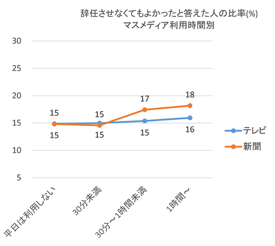 上図を見るとネットメディアでは利用時間が増えるにつれて辞任させなくてもよかったという人が増えている。全体平均15%に対し、ネットメディア利用時間が1時間以上の人では20%程度の人が辞任させなくてもよかったと答えている。特にFacebookを1日に1時間以上利用する人では、舛添氏を辞めさせなくてもよかったと考える人が26%にもなっている。一方、マスメディアの利用時間に関しては下図に見るように横ばいで変化はない。