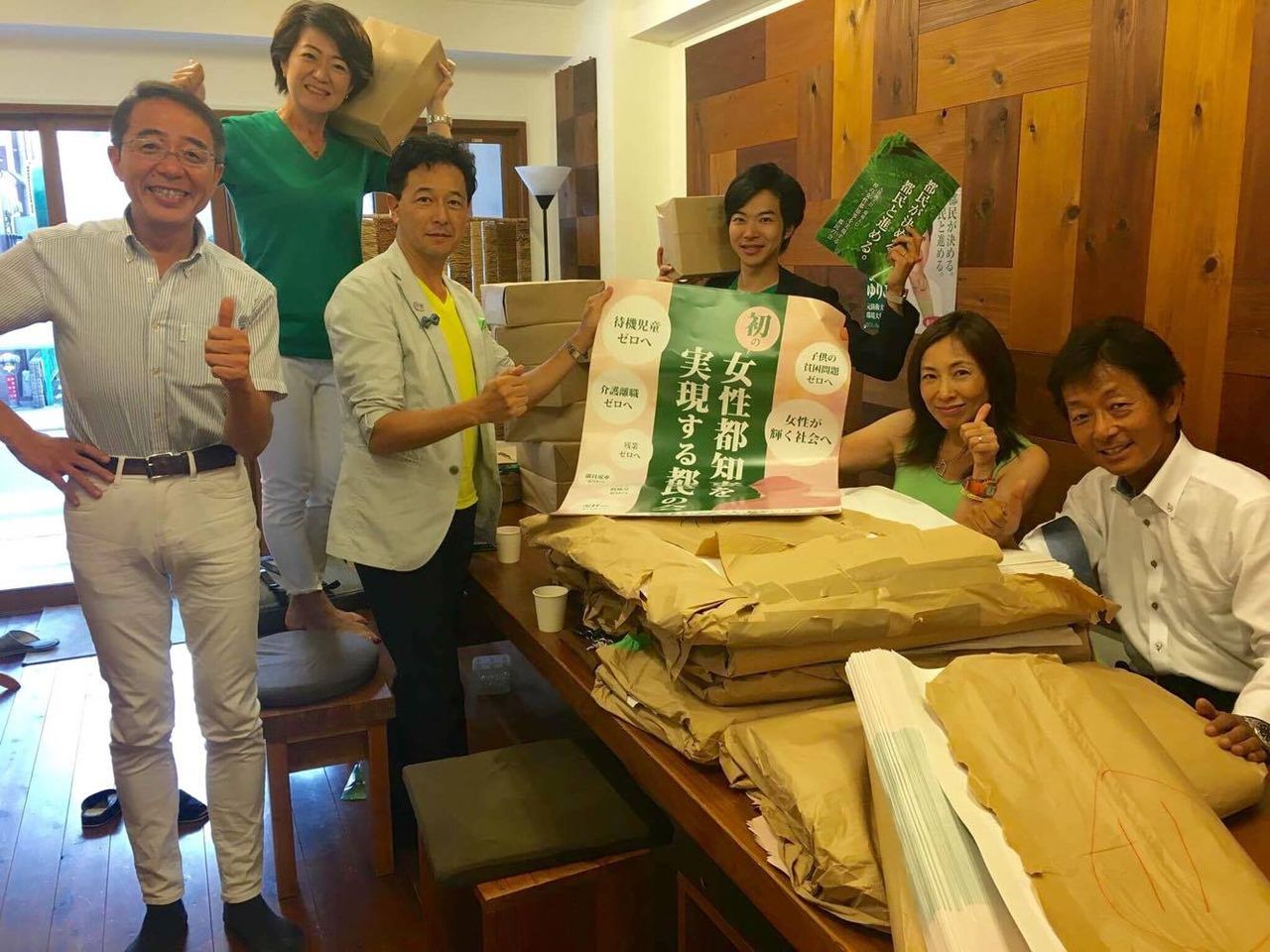 (公営掲示板ポスターを各地に貼り、公選ハガキ協力をしてきた無所属改革派地方議員メンバー。左より、渡辺大三小金井市議、関谷二葉元豊島区議、両角みのる都議(八王子)、音喜多駿都議(北区)、お姐、榎本茂港区議)