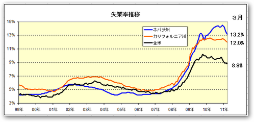 労働省によると、全米で最も失業率の高い州はネバダ州の13.2%。前月の13.6%から0.4%改善しているものの、失業率の低下は求職者数の減少によるものと見られている。ネバダ州に次いで失業率が高かったのはカリフォルニア州、そしてフロリダ州(11.1%)、ロードアイランド(11.0%)、ミシガン(10.3%)となっている。なお、失業率が最も低い州は3.6%のノースダコタ、そして4.2%のネブラスカ、サウスダコタ(4.9%)。