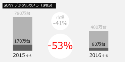 ソニーのデジタルカメラの販売台数は、170万台から80万台に半減している。CIPAの統計によると、メーカー全体からの出荷数量も780万台から480万台と41%落ち込んでいるが、ソニーは熊本大地震の影響によって部品調達ができなかったことが、市場を上回る落ち込みの原因となったと説明している。