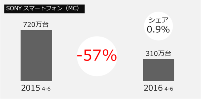 ソニーのスマートフォンXperiaの販売台数は、普及価格帯モデルの絞り込みや不採算地域での事業規模を縮小したことによって、昨年同期に比べて57%減少した。310万台という数字は、世界市場で見れば1%にも満たない。