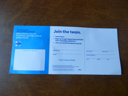 その上で、「私はヒラリーに投票することに同意します」と印刷された欄に署名を求めます。署名をした有権者には、有給のスタッフ及びボランティアのリーダーの連絡先が入った半券を渡します。残りの署名した部分は、支持者の家ないし選対に持ち帰ります。通常ですと、投票日の1週間前に署名の入った部分を有権者に郵送し、「コミット」させ、投票率を高めるという仕組みになっています。