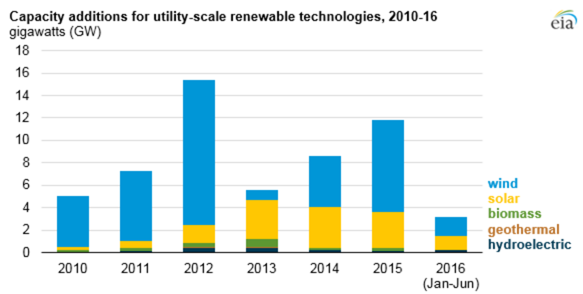 Capacity additions for nonhydro renewables have collectively accounted for most of the electric capacity additions over the past three years in the United States. Capital costs of solar and wind facilities have declined considerably in recent years. Other factors in the growth of nonhydro renewable capacity include policy-based incentives, such as state renewable portfolio standards and tax credits. Key tax credits such as the production tax credit and the investment tax credit have generally been in effect over the past several years and were extended in December 2015.