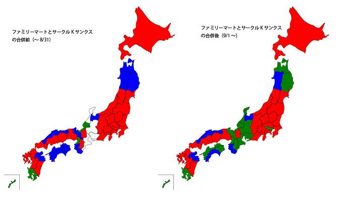今回のファミリーマート、サークルKサンクスの合併によって、店舗シェアは大きく書き換わった。8月までの全国ベースでの3社のシェアは、セブン-イレブンが43.6%、ローソン29.0%、ファミリーマート27.4%である。9月以降はサークルKサンクスがファミリーマートに加わるため、セブン-イレブンが38.1%、ファミリーマート+サークルKサンクスで36.6%、ローソンが25.3%となる。