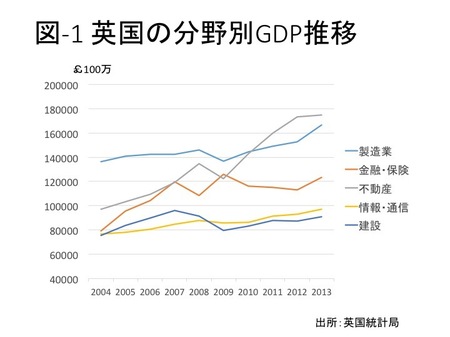 脱EUの投票結果を見ると、製造業が衰退した地方においては、EU離脱派が勝利を収めた。英国経済の最近の成長は、不動産、金融などによりもたらされているが、その恩恵を主として得たのは都市部であり、製造業が衰退した地方との格差が拡大した。地方の成長を実現することが、いま必要とされているとの判断だろう。そのためには製造業だ。英国の分野別国内総生産額(GDP)の推移は図‐1の通りであり、製造業は伸び悩んでいる。図-2の通り主要先進国では製造業がGDPに占める割合が最も小さい国になっている。