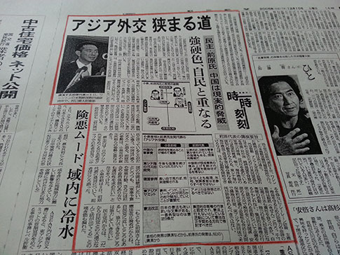 写真は、前原誠司民主党代表(当時)が2005年12月8日、米戦略国際問題研究所(ワシントンDC)で行った講演の内容を伝える、朝日新聞の記事です。