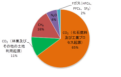 「温室効果ガス=エネルギー起源CO2」というイメージが強いが、その他のガスについても排出量は小さくはない。IPCCの第5次評価報告書(第3作業部会)によると、2010年の世界の温室効果ガス排出量のうちエネルギー(化石燃料)及び工業プロセス(注5)起源CO2は全体の65%であり、林業及びその他の土地利用起源CO2及び他のガスが残りの35%を占めている。