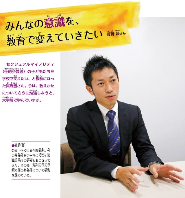 2/3セクシュアルマイノリティ(性的少数者)の子どもたちを学校で支えたい、と教師になった眞野豊さん。今は、教えかたについてさらに勉強しようと、大学院で学んでいます。